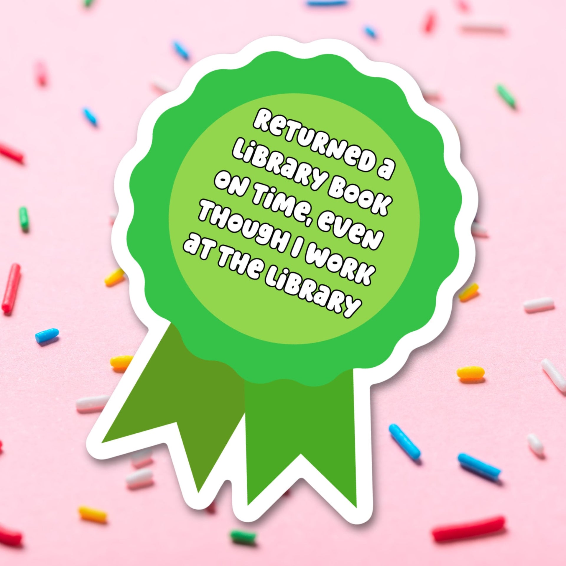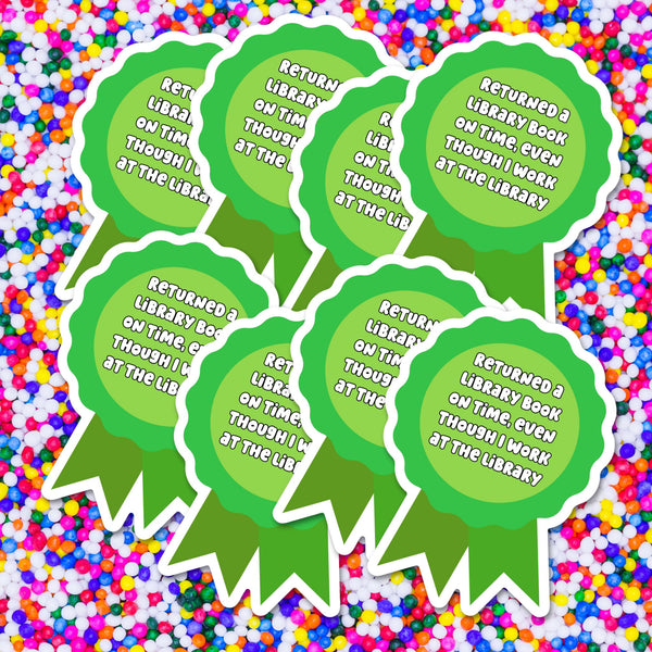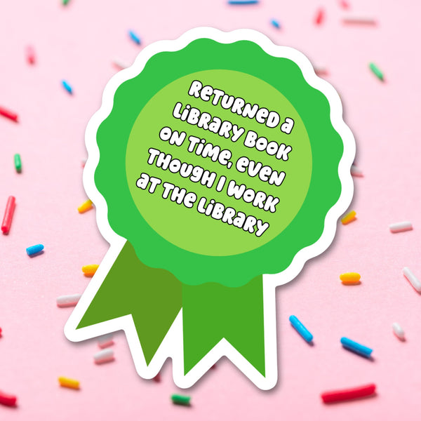 Introducing our self-aware "Library Staff Book Return Award" Vinyl Sticker – a clever and relatable accessory that playfully acknowledges the irony of library staff sometimes struggling with their own overdue books! This 3-inch vinyl sticker features a whimsical design resembling an award ribbon, displaying the text "Returned a library book on time, even though I work at the library" to poke fun at the predicament that many library employees know all too well.