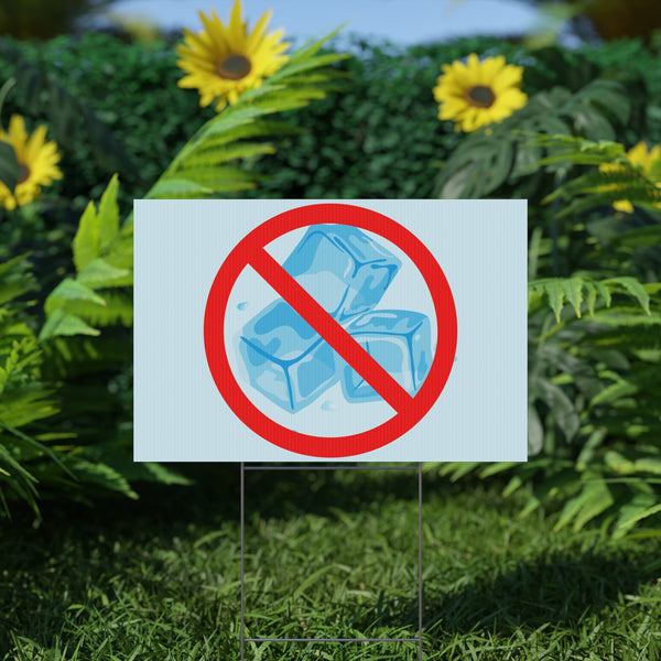 A durable outdoor yard sign that speaks clearly and visually. This corrugated plastic sign features a bold red prohibited symbol over ice cubes — a concise, visible statement from the curb or garden bed. Printed on both sides with a matte finish, the sign resists glare and reads well in daylight. Lightweight yet sturdy, it slides onto the included aluminum stake and holds steady in lawns, pathways, or event spaces. Made and printed in the USA, a portion of every sale will go towards immigrant rights groups.
