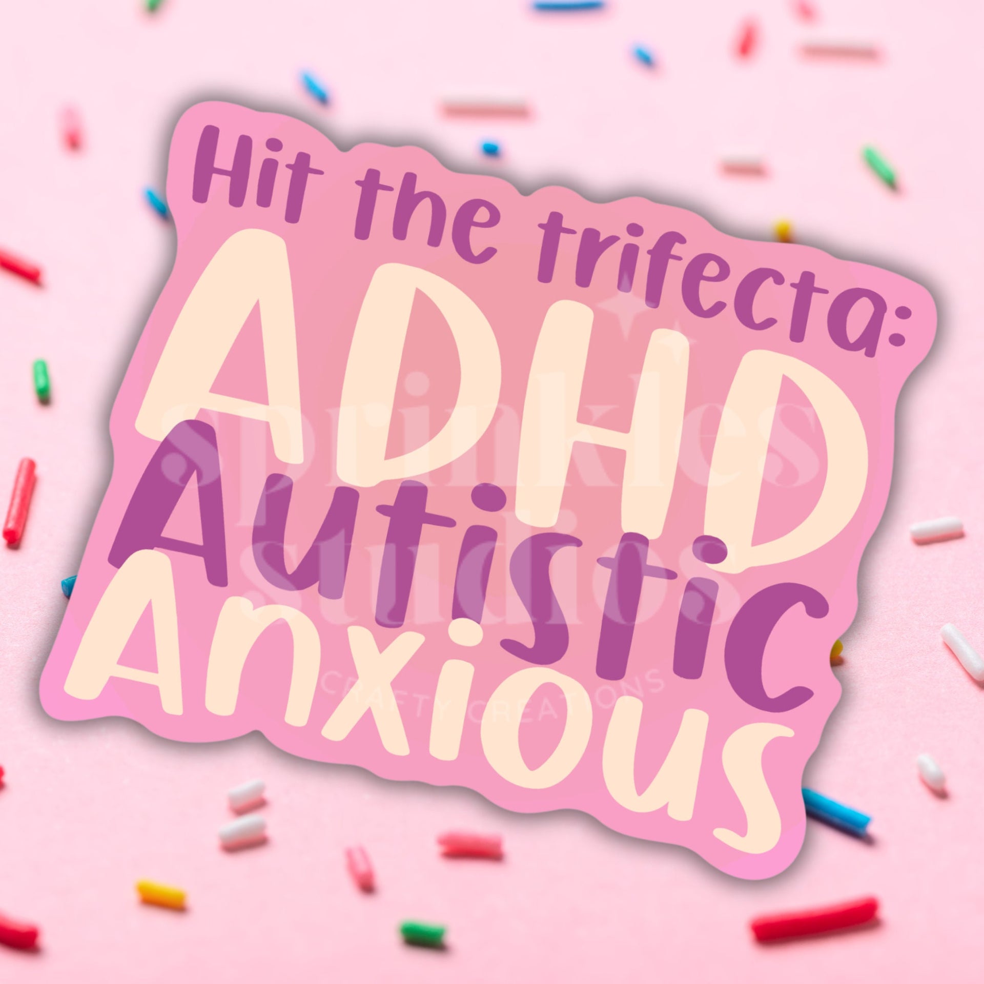This high-quality vinyl sticker showcases a straightforward and eye-catching design with the statement "Hit the Trifecta: ADHD, Autism, Anxiety," acknowledging the often complex interplay of these conditions in daily life. Made from durable, weatherproof materials, this 3-inch sticker is perfect for personalizing your laptop, water bottle, notebook, or any other surface you want to adorn with a touch of self-expression and neurodiversity pride.